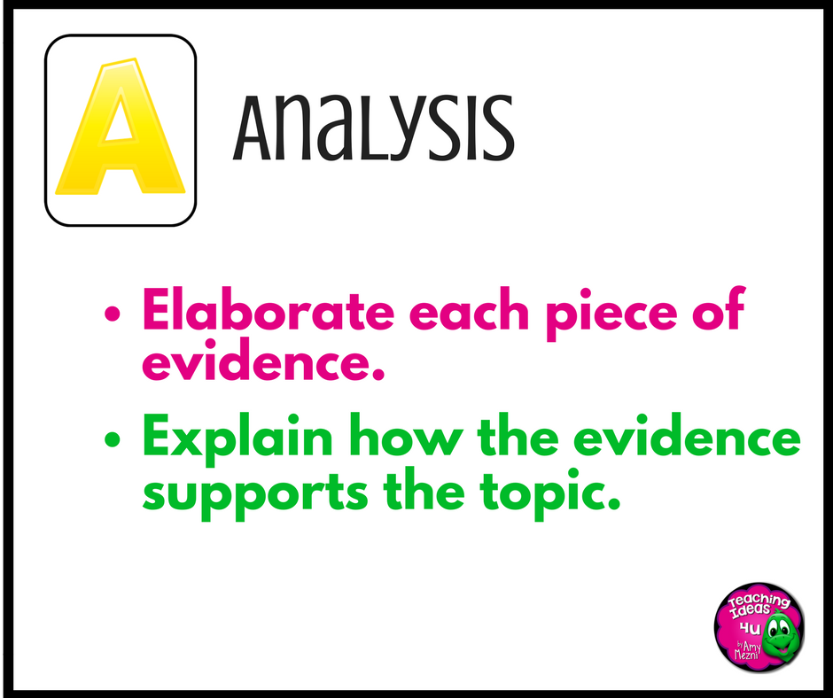 The A stands for analysis. This piece is really hard for students. In a nutshell, analysis means how does the evidence support your topic or claim. Convince the reader that you are correct. For example, if I say that the Puritan Church affected the development of New England, my analysis would be how it affected it. While adding the analysis, students should:
