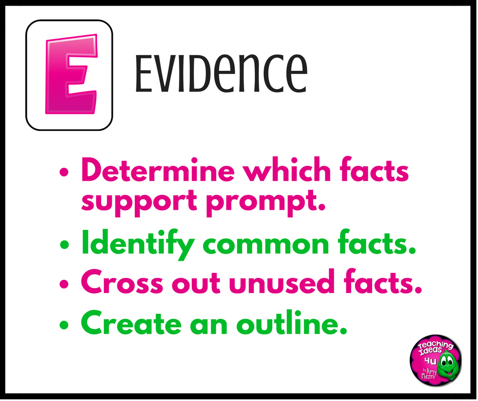 The E in Teach stands for evidence. It is important to pull out the evidence from the reading, because it makes it easier to plan the essay. When I teach students to read documents, they summarize main ideas in each paragraph (see that previous post). That makes the E and A sections much easier, because students only have to look through the main ideas. This is much less stressful, especially for your students with ADD, learning disabilities, or low readers. In this section, students should: